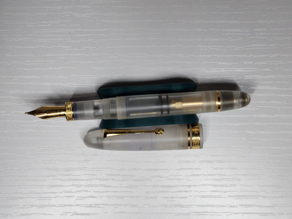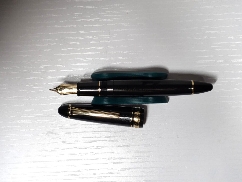 Sailor 1911L Shining Black Gold Trim with 18k medium nib (box and papers included; warranty through Appelboom). List price: $600; my price: $510 including international shipping. [this isn’t the world’s greatest pic… hard to capture the pearl fragments, which sparkle quite nicely]